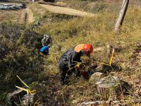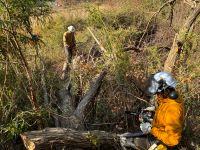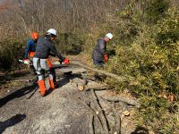 道路に近接した木は、あらかた伐ってしまったので斜面の上の方の木の伐採になります。