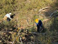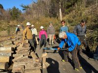 斜面の倒木をみんなで綱引きで引っ張り出します。
