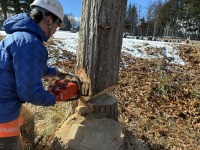 (※ 裂け上がりとは、追い口を入れる途中で幹がバリバリッと裂け上がって思わぬ方向に木が落ちてくることがある現象です。すごく危険です。)