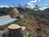 元玉(根元に一番近い部分の丸太)と幹の途中の双方にロープをかけて、間を切り離すことにしました。