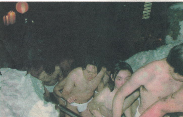 柳津で勇壮に七日堂裸まいり 会津地方の新春を彩る柳津町の福満虚空蔵尊圓蔵寺の「七日堂裸まいり」は七日夜、勇壮に繰り広げられた。 午後八時半。鐘の音を合図に地元の男性が自宅を、観光客や遠来の信徒は旅館から下帯姿で飛び出し「ワッショイ、ワッショイ」の掛け声とともに、はだしで百十三段の石段を一気に駆け上がった。 水をかぶって体を清めたあと本堂の菊光堂になだれ込み、大鰐口(おおわにぐち)を目指して打ち綱に飛びつき、次々とよじ登った。男たちの体からは湯気が立ち上り、堂内は熱気と興奮に包まれた。 祭りは「宝照の玉」を奪おうとする竜神を民衆が結束して追い払ったという伝説に基づく奇祭。今年は連休中とあって、大勢の観光客らで夜更けまでにぎわった。 (福島民報、2001年1月8日) |